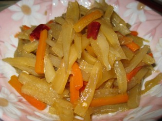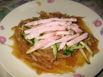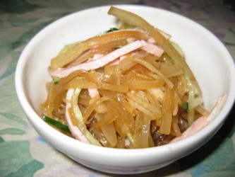 今日のもう一品はヤーコンの中華風サラダを作った。 | 30分ほど水にさらしてから生のまま(醤油、砂糖、酢、胡麻油、唐辛子)で和えた。 このシャリシャリとした食感が、何とも云えずヤーコンサラダも美味しく食べる事が出来た。 珍しい野菜をありがとうございました。 |