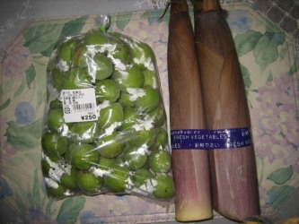 6月なのに竹の子が売っていたが、あまり見た事のない長くて細身の竹の子だ。 | 知らないおばさんが「ハチクと云って柔らかいのよね」と話しかけてきた。 急に竹の子ごはんが食べたくなって買ってきた。 調べるとハチクは淡竹と書くんだって。。アクも少なく柔らかいらしい。 ここ そして青梅が250円! 小さめの梅だが、梅ジュースを作るのには大きさは関係ない。 早速、竹の子ご飯を作り、梅は洗ってヘタを取り、ジュースを作るために冷凍した。 今日は主人に車で連れて行ってもらったが、自転車で15分もかからない場所なので 次からは、ひとりで行こうと思った。 |