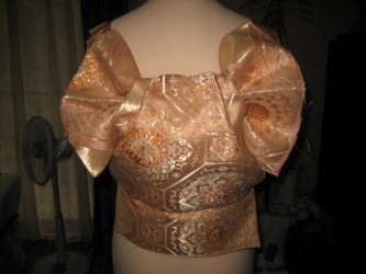 今日は6月2回目の着つけ教室の日。 前回は名古屋帯のふくら雀を教えてもらったが、今日は袋帯のふくら雀だった。 結婚式などで未婚の若い娘さんが結ぶ正装用の帯の結び方だ。 前回は2人でお互いに結びあう方法で習ったが、今日はT田さんがお休みだったので マネキンを使っての練習だった。 改良帯枕を使っての方法なので思ったよりは意外と簡単だ。 袋帯で結ぶふくら雀は、金糸、銀糸を使った帯のせいか豪華だ。帯によって感じが違うね。 そして、前回の復習も兼ねて名古屋帯のふくら雀の少し変形バージョンを習った。 羽根が2枚になり少し華やかな感じに見える。 前回の羽根が1枚の結び方はここ