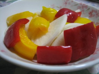 最近、パプリカって甘くて美味しいと良く食べている。 | 炒めて、塩コショウだけでも美味しいが、ピクルス →ここ も美味しい〜〜。 かぶが無かったので、きのう買った大根とパブリカで作ってみた。 そして酸っぱい物が大好きな私がお気に入りの簡単大根の漬物。 大根のいちょう切りを1日干してから(これが大事!)、めんつゆ、酢を適量、 ビニール袋に入れて、空気を抜いて縛り、ひと晩おくと、出来上がり! 超簡単なのに、ポリポリと止まらなくなる美味しさ!(笑) |