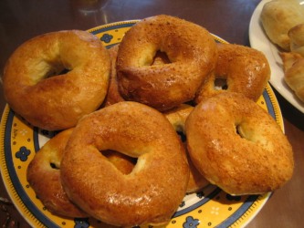 朝、起きると、パンの焼ける美味しそうな匂いが。。。 | 美映が早起きして、3種類のパンを焼いていた。 ウィンナーソーセージが中に入っているパンは子供達の大好きなパンだ。 そしてチーズ味のベーグル。 とっても美味しい〜♪ 大拍手!! 臨月の妊婦さんなのに、身軽で元気いっぱいだ。 |
