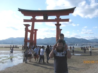 宮島の大鳥居の前で、パパに肩車してもらって、嬉しそうな柑太の写真。 | 干潮時には大鳥居まで歩いて行けるんだね。 私が行った時は満潮時だったので、大鳥居は海の中にそびえ立っていた。 厳島神社と合いまって素晴らしい風景だった。 世界遺産だものね。 そして放し飼いされている鹿を撫でている写真。 鹿と柑太のビデオを見て、主人と大笑いした。 → ここ 始めて見る鹿に柑太は興味しんしん! 触ってみたい様子にパパが、そばに連れて行き 手を持って触らせた。そしたら、なんと! 鹿の毛を引っ張っているよ〜〜(笑) 鹿が怒ったら危なかった〜。 おとなしい鹿で良かったね。 |