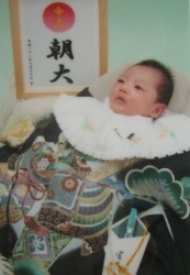 朝大のお祝いのお返しの内祝いに入れるカードの写真にどっちがいいと思う?と | 美映に聞かれた。 初宮参りの着物の写真と満面笑顔の写真だ。 もちろん、可愛い笑顔の方がいいんじゃない?と答えた。 母乳がいっぱい出ているお陰で、まるまる太っている朝大、笑顔が可愛い〜♪ |