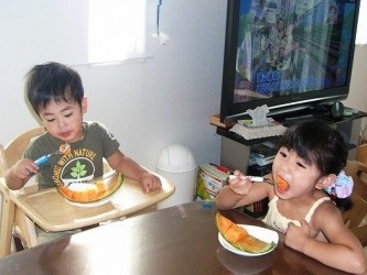 美映からも有佳里と光汰朗の写真と動画が届いた。 | メロンを大きな口を開けて食べている写真と 「お名前は?」「何歳ですか?」の質問に答えている光汰朗の動画→ここ 「わざと赤ちゃん言葉で話しているの?」と聞いてしまったが、普通に話しているよと。。。 有佳里の「お名前は?」の動画はどんな話し方をしているか「有佳里のページ」を見てみた。 2歳3ヶ月の有佳里は、ずいぶんと小さい感じだ。 その動画は→ここ そしてマロンがほんの少しだけ写っていた。 何度も見てしまった。 有佳里とマロンは、いいコンビだったと懐かしく思い出した。 そして光汰朗はオムツが、すっかり取れてラクになったと美映が言っていた。 私が愛知に行っている間、特訓中で居間におしっこをもらして水たまりを作っていた。 朝大が生まれたばかりで、オムツが2人分重なり、かなりのゴミの量で大変だった。 すっかり取れるまで2〜3週間かかったけど、今は完璧だよってママも喜んでいた。 |