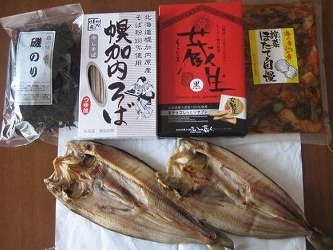 先日、小樽の妹からチルドの宅急便が届いた。 ほっけの干物、磯のり、幌加内そば、生チョコサブレの「蔵生」のお菓子、 帆立入りの搾菜のピリ辛の漬物、私が好きな物ばかりの嬉しい小包だった。 早速、ほっけの干物を焼いて夕食に食べたが、油がのって美味しい〜♪ 小樽のほっけは、やっぱり違うと感心した。 昔は、皮を食べなかったが、主人が食べているのを見て食べる様になった。 鮭の皮は食べるけど、ほっけの皮は硬そうと思っていたが、皮と身を一緒に 丸かじり(笑)してみたら、見た目程、硬くなく、美味しいのだ。 しばらく、北海道の味覚を楽しめるわ〜♪