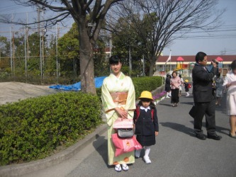 小学校でも制服があって、毎日の洋服選びに迷わなくてママも大助かりだよね。(笑) | 家から学校まで3分の近さなので、小学校で記念写真をとデジカメを持って一緒に出掛けた。 着物姿のお母さんが、思ったより多くてびっくりした。 着物の丈が短か過ぎて裾から長襦袢が見えたり、襟の抜き加減が少なかったり、 半襟の幅が左右違ったりと、もしかしておばあちゃんに着せてもらったのかと思える人が ほとんどで、美映の着付けが今イチ、気になった私だったが、少しホッとした。(笑) 幼稚園で一緒だったお友達とママも一緒に写真を撮った。 その後、私は家に戻り、お赤飯の準備をしたりして光汰朗、朝大と留守番をした。 夕食はたくさんのお刺身と茄子と鶏肉の煮物、生もずくの酢の物で、お祝いした。 有佳里ちゃん、小学校入学おめでとう♪