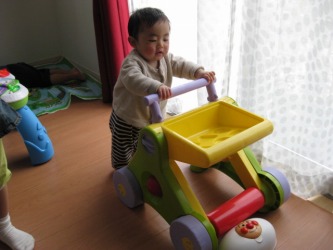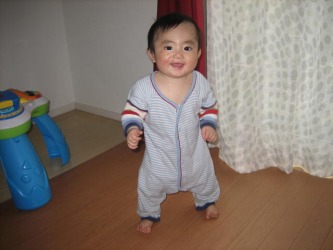 朝大が1歩、2歩と歩き始めたと聞いていたのだが、せっかく歩いても 私は見る事が出来ず、その瞬間をビデオに撮るのは無理だった。 デジカメを向けると、お座りしたり、ハイハイしたりで中々歩いてくれない。 まだ9カ月の朝大は、お座りもハイハイもつかまり立ちも3人の中で1番早かったみたいだ。 そのうち歩くのは決まっているけど、私のいる間にビデオが撮りたいな〜