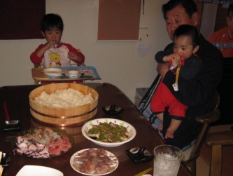毎日、忙しくて三太さんと一緒に夕食を食べる事が出来なかったが、 | 明日、私達が帰るという事で、今日は早く帰ってきてくれた。 みんなが大好きな手巻き寿司。 有佳里も光汰朗もよく食べていた。 私も、また今夜も美味しくて食べ過ぎてしまった。反省!(笑) 朝大の歩くビデオは撮れなかったが、ひとりで立ち上がるビデオは撮れた。 ビデオは →ここ つかまらないで立ち上がる事が出来れば、すぐ歩くはずだよね。